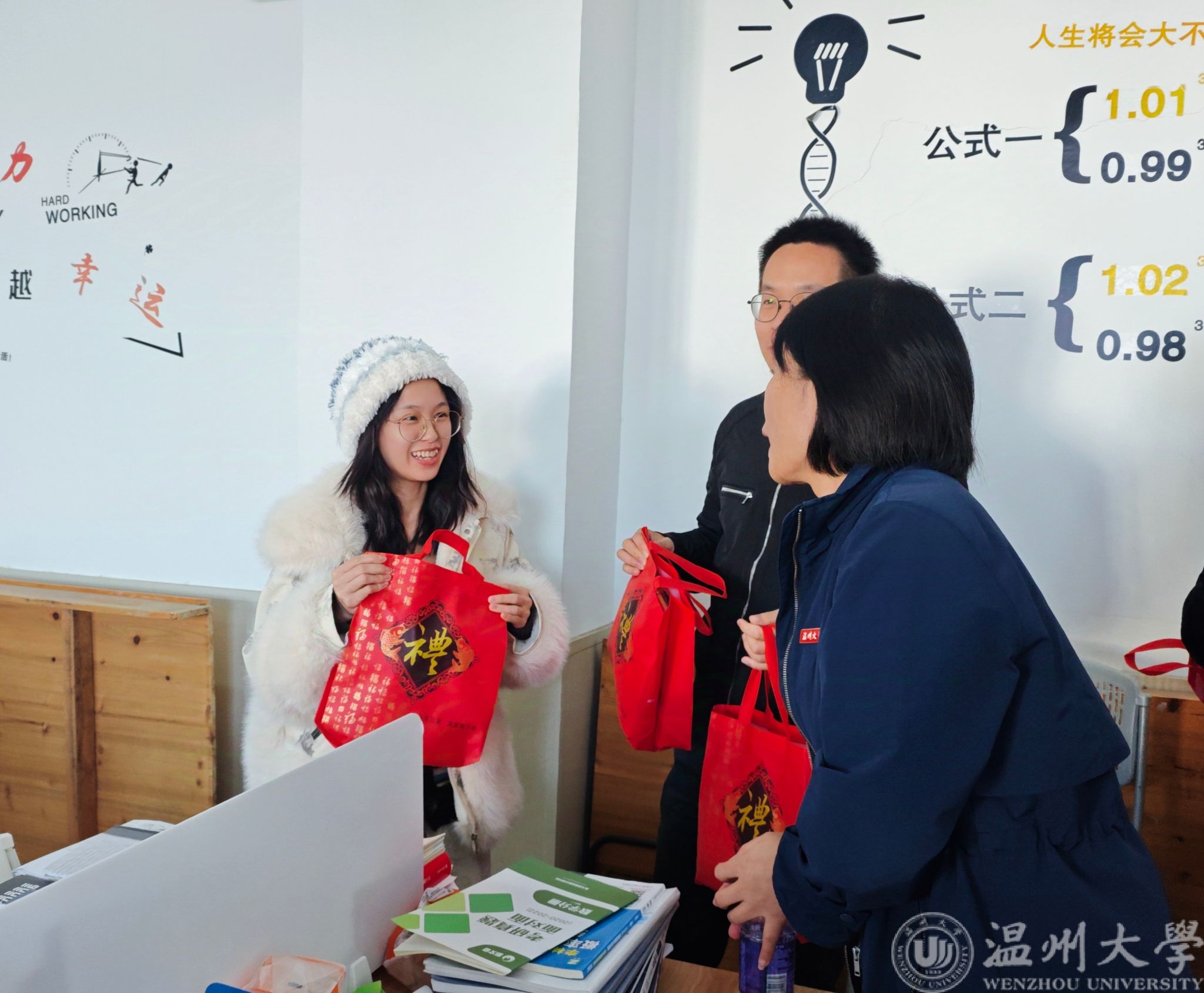 下午15:00,学院党委书记陈文远、学术副院长谢文浩及学工办辅导员陈海彤、余明新、潘文老师来到学院316和318考研自习室,亲手将满载祝福的“冲刺大礼包”递送到每一位备考学子手中。