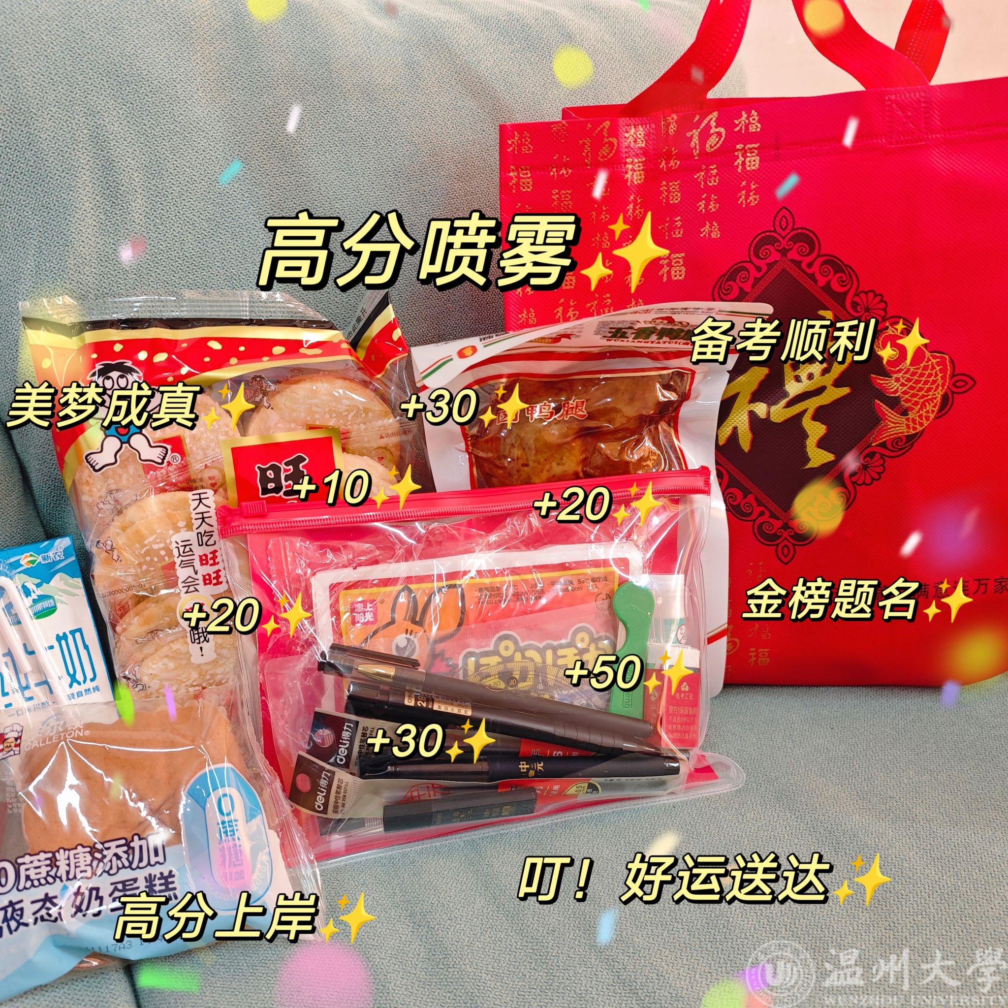 学院精心为大家准备了实用的“慰问大礼包”,助力大家最后的冲刺。既有考研战场上必备的文具用品,包括黑笔、涂卡笔、小刀及胶棒,确保大家在考场上“装备齐全”,书写自如;考虑到天气渐冷,学院还贴心地为学子们准备了暖宝宝,希望能在寒冷冬日为大家驱散寒意,保持最佳状态备考;同时还有丰富多样的能量补充食物,寓意“糕”中的蛋糕,“压”倒一切困难的鸭腿,考运“旺旺”的旺旺雪饼,思路纵享“丝滑”的牛奶等。让大家在紧张复习之余,及时补充体力,元气满满地迎接挑战。