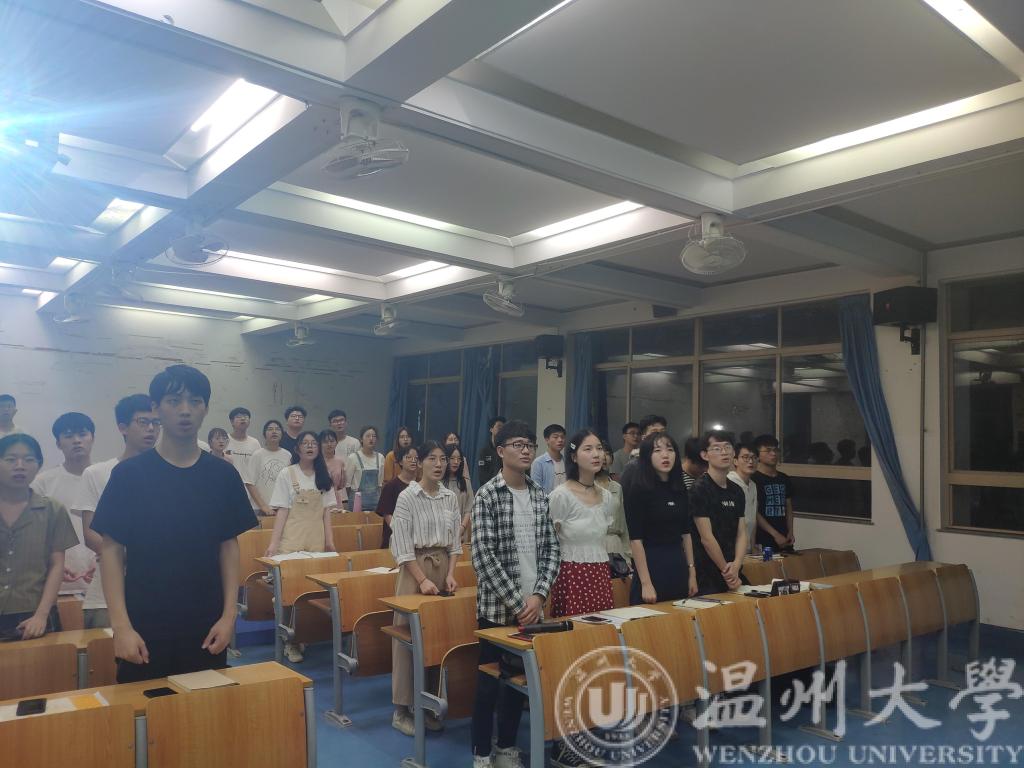 晚上18:30,会议准时开始。首先进行的是会歌合唱,“我们是团结的集体,相信我们会创造奇迹”,响亮的歌声透露着数电团学的团结与坚定。紧接着进行的是各部门四月工作汇报以及先进个人颁奖。本次获奖的优秀团学成员是陈哲银、张宸、王晋萱、王立同、盛旋、孙瑩斐等六位同学。随后,学生会主席黄文栋对团学近期工作进行了总结:一、团学干事要以部长的工作能力要求自己,守纪律,按时值班签到;二、提高团学工作效率,根除懒散风气,发扬数电的优秀品质;三、要不忘初心,牢记进入团学的目的,不以迷茫的状态消磨时光。最后,黄文栋也衷心地表达了对于数电学院的美好期待,希望它能越来越好。