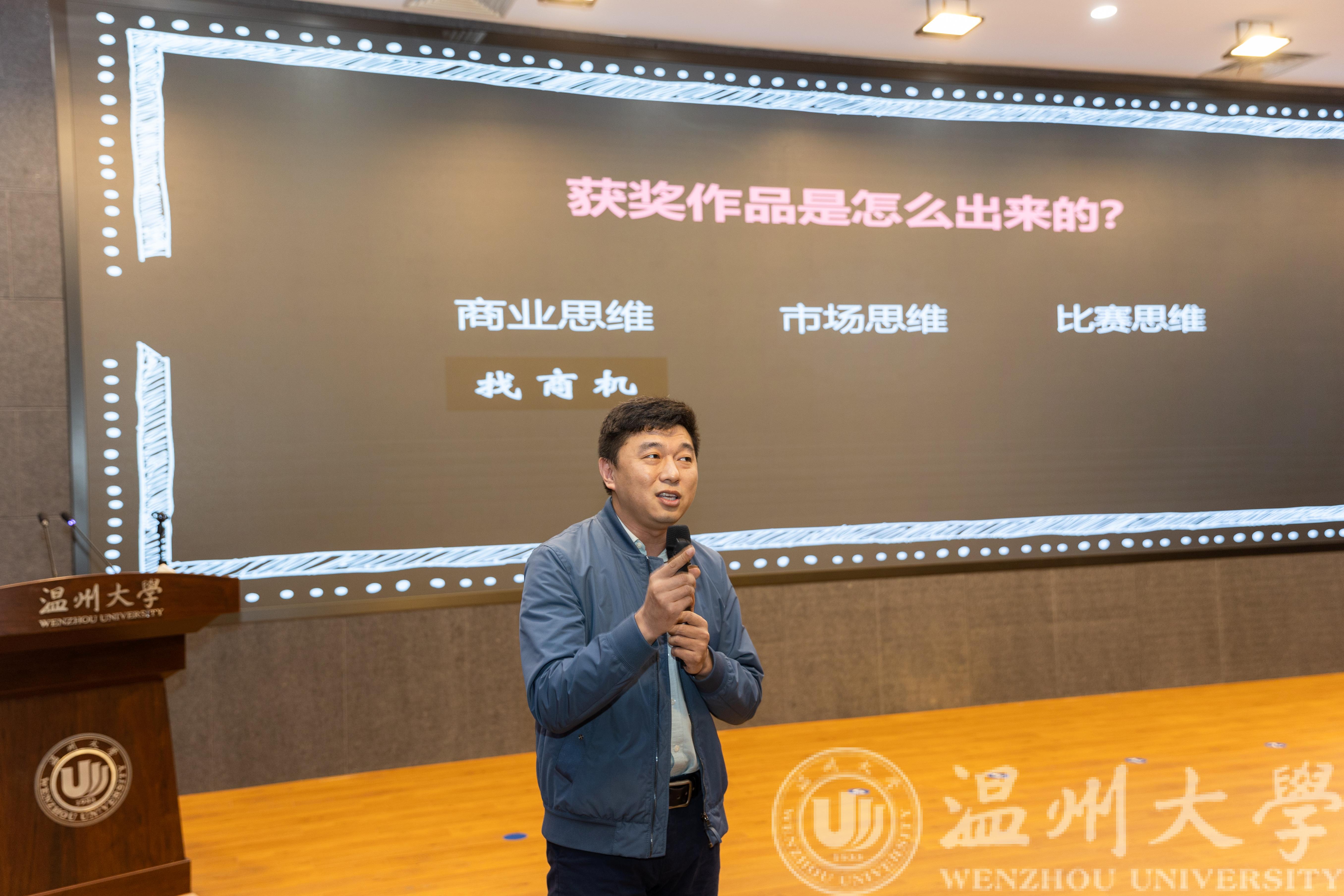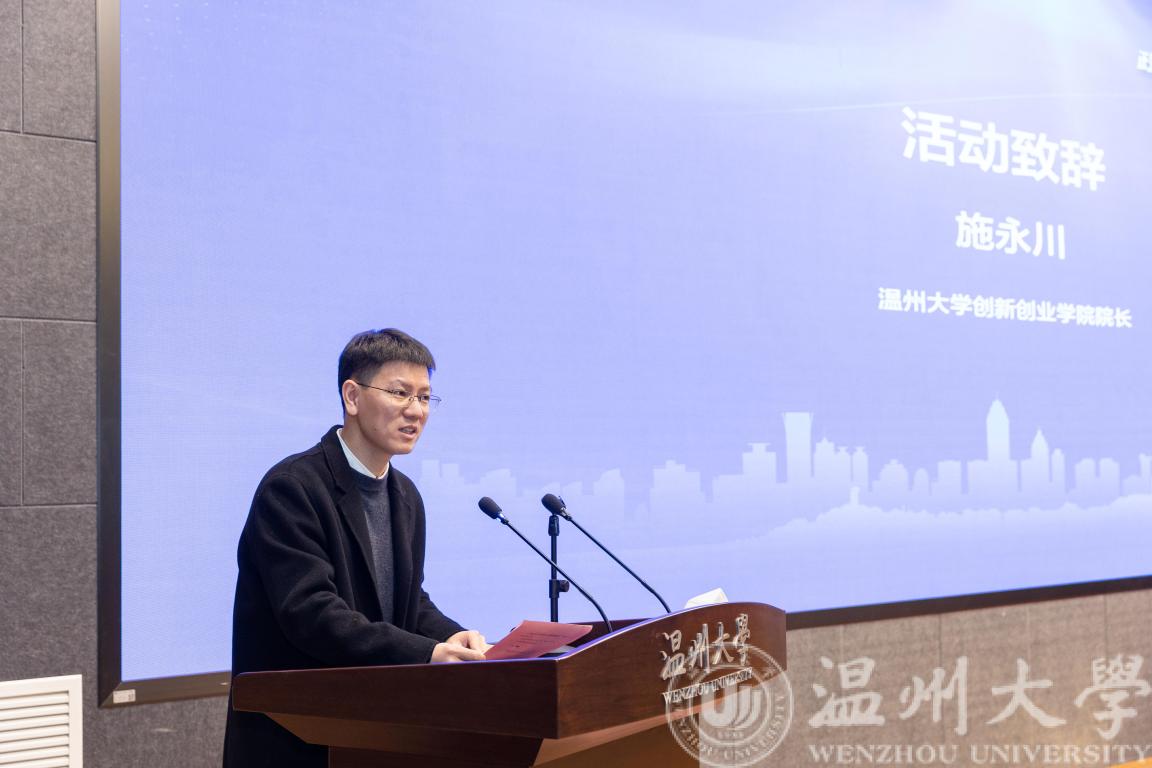 活动开始,由温州市创新创业学院院长——施永川进行致辞,施院长着重强调了温州人的创新创业精神,提到“走遍千山万水,说尽千言万语,想尽千方百计,吃尽千辛万苦”的四千精神,鼓励支持大学生创新创业。