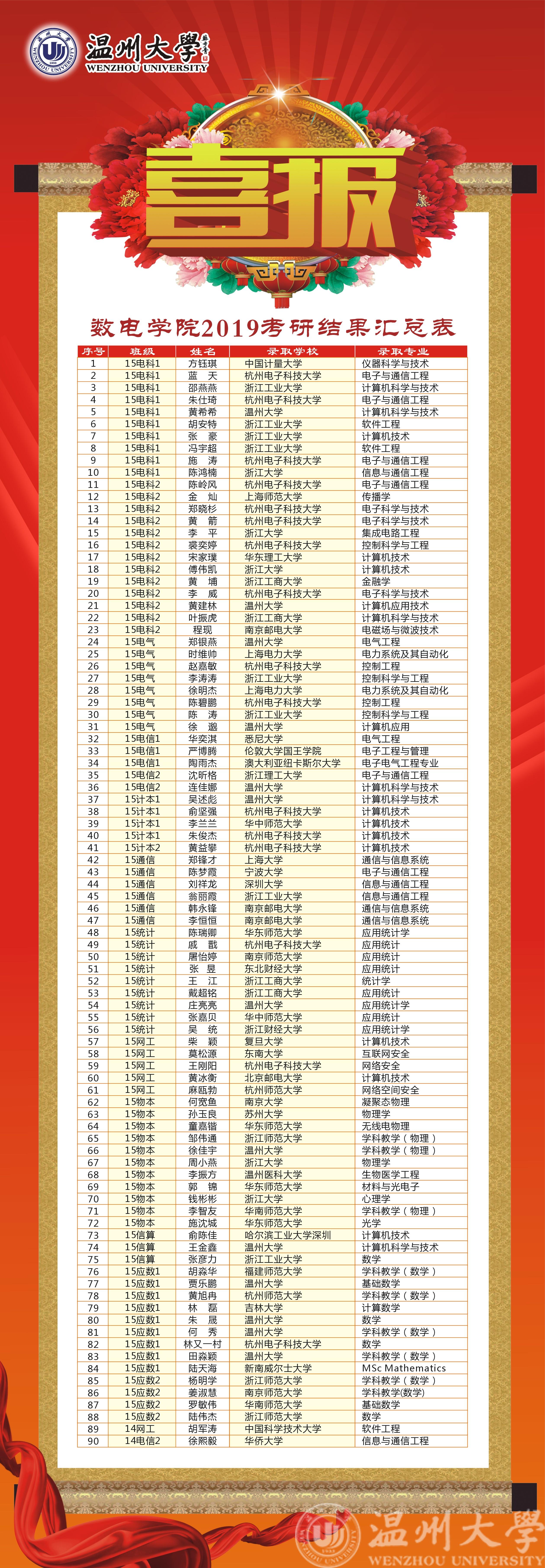 在17吃瓜网 学子不懈奋斗中和全院老师的关心、指导下,2019届毕业生在研究生入学考试中,共有88人成功考取了浙江大学、复旦大学、南京大学、东南大学等国内外知名院校研究生,录取率突破14.5%。在此全院师生共同祝贺同学们取得的优异成绩,并预祝他们在今后的求学路上再创辉煌!