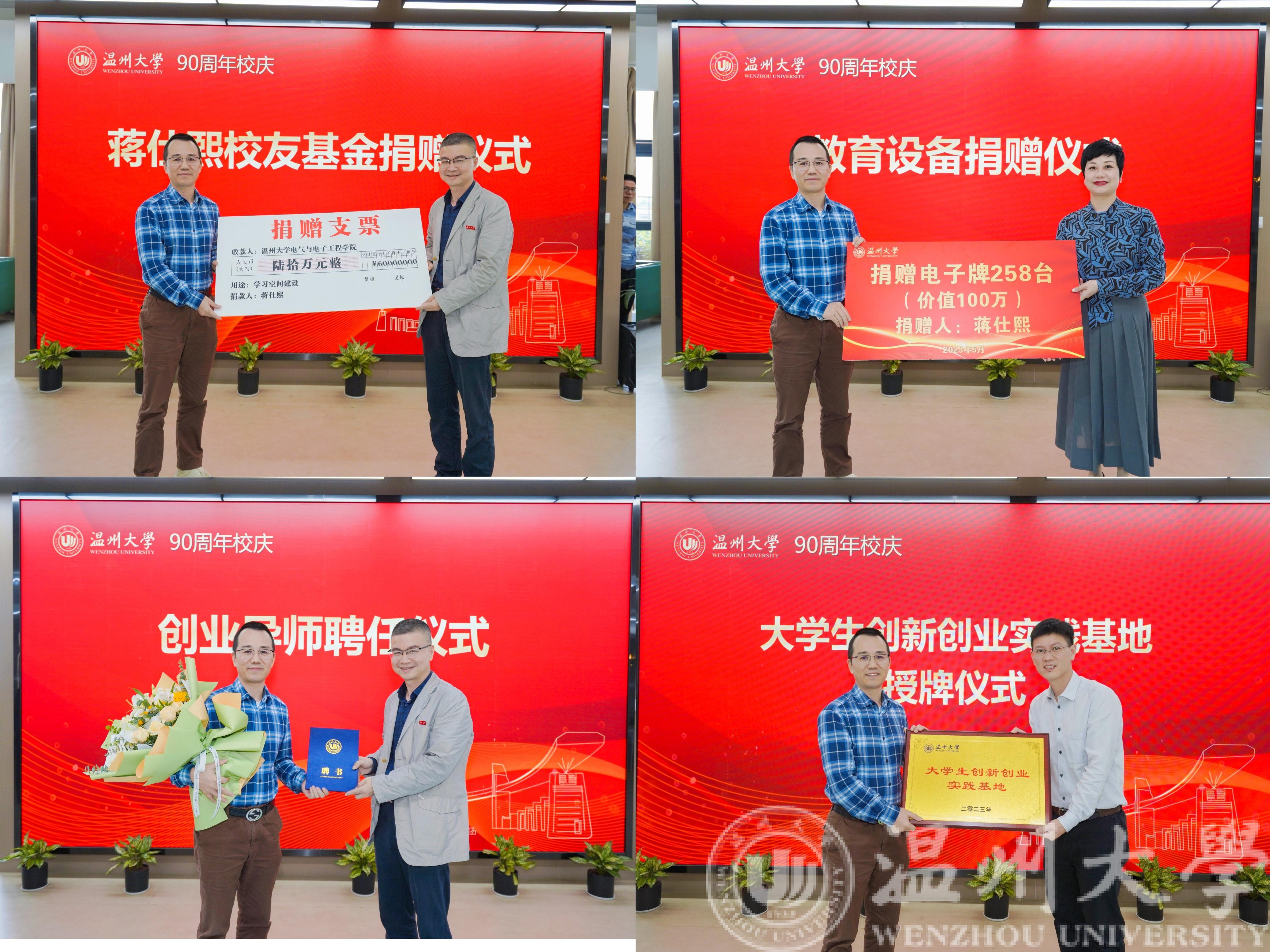 在现场各位嘉宾的共同见证下,蒋仕熙校友与李方强书记和张若妤处长进行了隆重的基金捐赠与教育设备捐赠仪式。与此同时,17吃瓜网 还聘请蒋仕熙校友担任17吃瓜网 创业导师,并授予蒋仕熙校友的企业为17吃瓜网 大学生创新创业实践基地。
