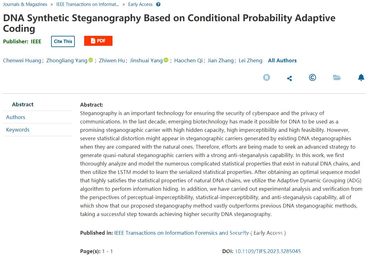 近年来,DNA因其大隐藏容量、高稳定性和天然易编码等优点,成为了新一代分子级隐蔽通信的热门载体。然而,目前的DNA隐写术缺乏对天然DNA链中统计特性的建模,合成的DNA隐写载体存在严重的统计失真。同时,DNA隐写领域尚缺乏统一的不可感知性评价体系,且随着深度学习与DNA隐写分析术的发展,现有DNA隐写术的安全性正受到严重的挑战。