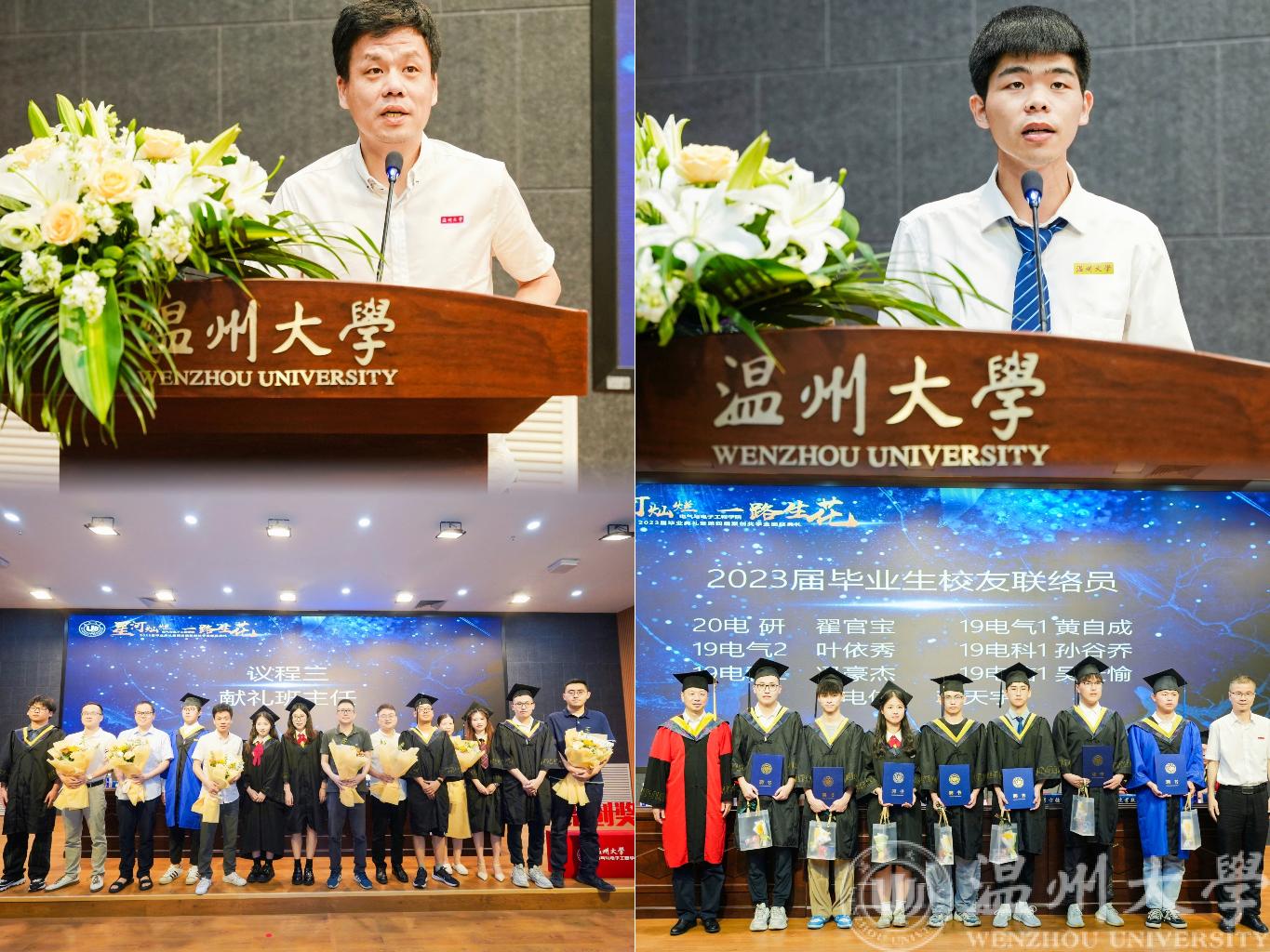 随后,各毕业班学生代表手捧鲜花,献给他们入学三四年来辛勤付出的班主任老师。伴随温馨的音乐响起,学生代表们向班主任老师行谢师礼。感恩献花仪式后,19电气2班班主任周志立老师和20电气工程(研)谢远峰同学分别作为师生代表上台发言。典礼上还为省校优同学颁发了荣誉证书,为各位校友联络员颁发了聘书。期间还观看了由学院领导、2023届毕业班班主任、学弟学妹们为毕业生们录制的祝福视频。一张张熟悉的面孔,一个个亲切的笑容,一句句温暖的祝福,为各位毕业生增添前行的力量,激励他们以无畏的勇气探索浩瀚星空。