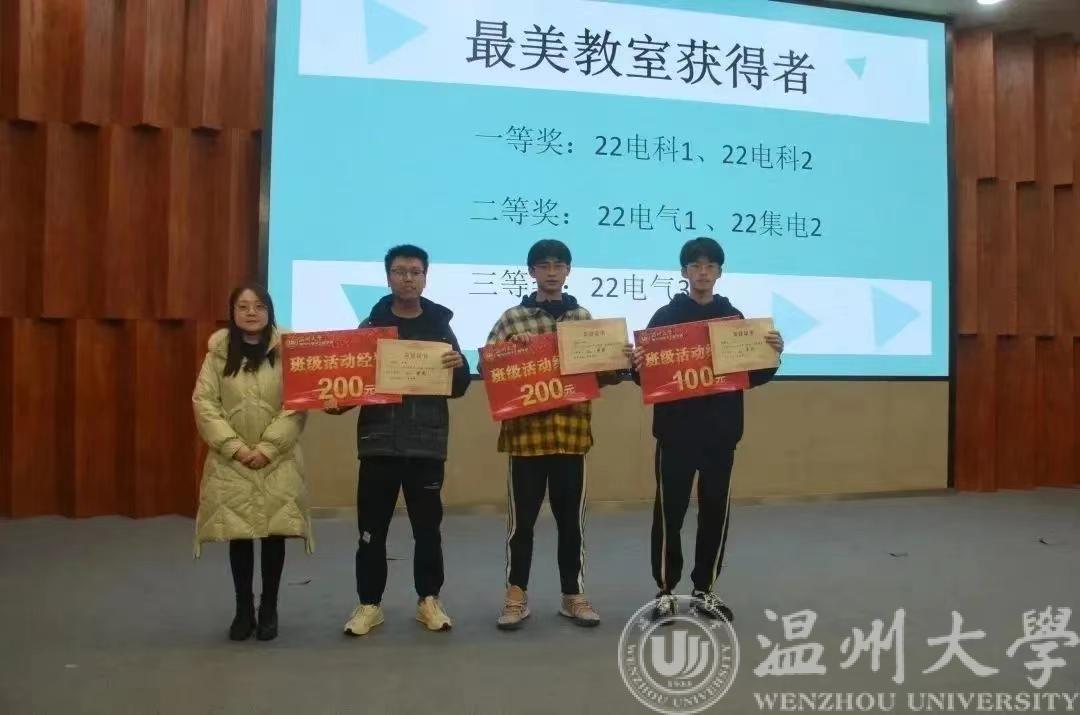 学工办主任廖晓安老师、辅导员陈海彤老师为“最美班级”获奖班级颁奖;辅导员屠昌浩老师、余明新老师为获奖寝室颁奖。