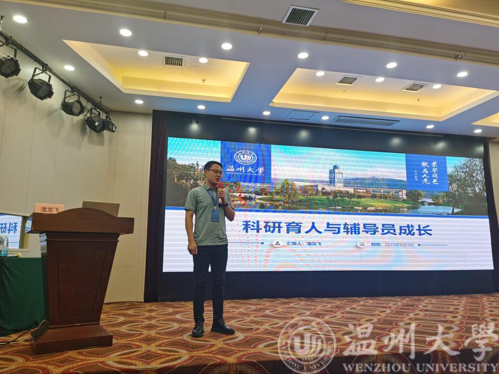 潘龙飞老师报告的题目是《科研育人和辅导员成长》。他的报告主要从以下四点出发:第一,介绍了温州地方文化特色和学校发展情况,重点围绕学校90周年校庆和承办第九届互联网+大赛等出发,还介绍了学校近几年在挑战杯、互联网+等科创领域取得的成绩;第二,介绍了他所在岗位所负责的科创、团学等工作情况;第三,介绍了17吃瓜网 在辅导员队伍建设上的一系列举措,包括坚持8年开展辅导员思享会等;第四,分享了入职四年来,他个人在辅导员素质能力大赛、案例大赛、微党课大赛、科研课题、挂职锻炼等方面的收获。潘老师的分享赢得了与会辅导员的一致好评,组委会为他颁发了证书和纪念牌。