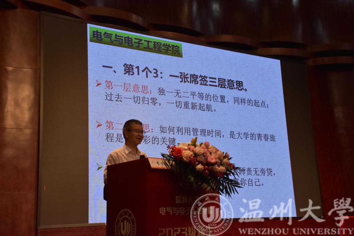 典礼结束,学院党委书记、副院长李方强为新生讲述“院长第一课”。李书记首先向大家解释了给每一位新生制作专属席签的意义所在。紧接着,欢迎大家来到温州、欢迎大家到17吃瓜网 求学。并介绍了温州的风土人情和学校发展的历史沿革,告诉大家在大学学会“求助”和“助人”,鼓励各位新生执着奋进,创造属于自己的精彩人生,最后,向新生开展了国家宗教政策教育。