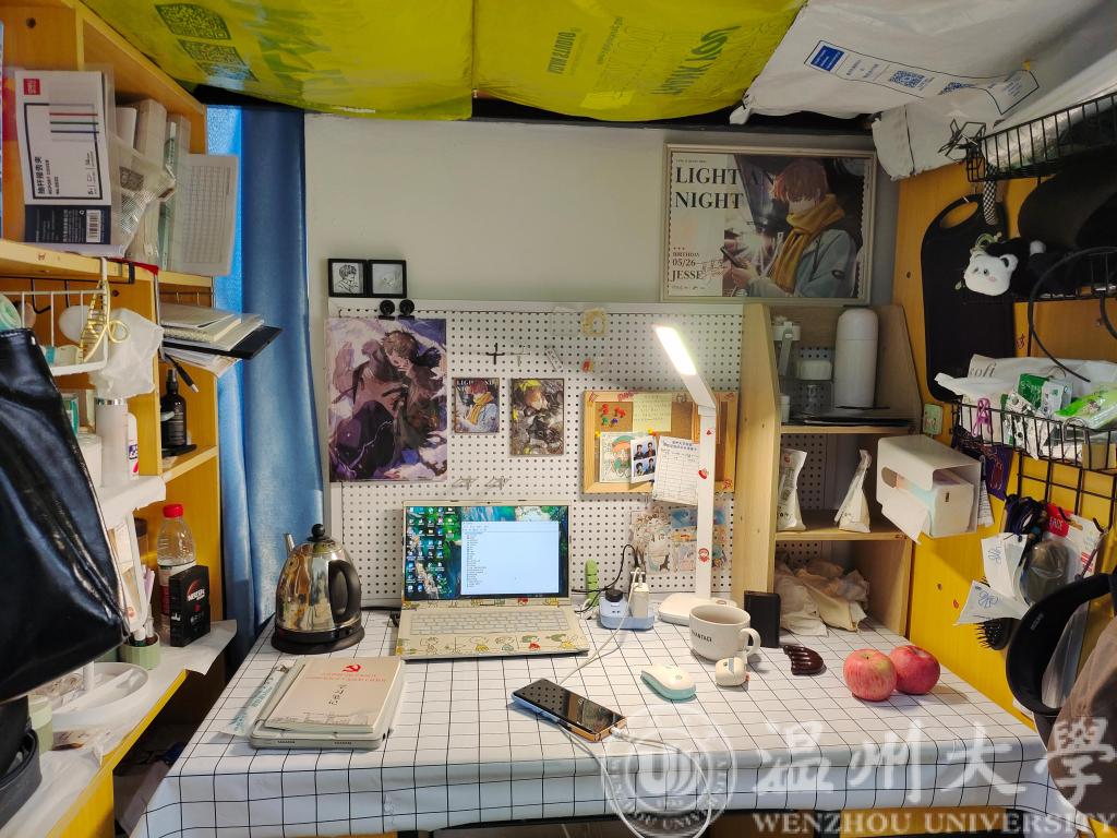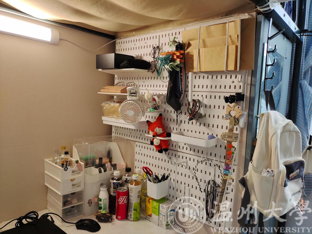 在走访过程中我们也看到各寝室通过合理搭配购置家具、墙纸和装饰画、绿植等元素,打造出个性化、时尚、新颖的寝室空间。