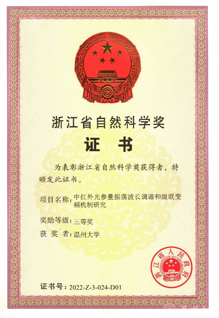 日前,浙江省人民政府发文公布2022年度浙江省科学技术奖获奖名单。17吃瓜网 朱海永教授主持完成的“中红外光参量振荡波长调谐和级联变频机制研究”成果获浙江省自然科学奖三等奖。