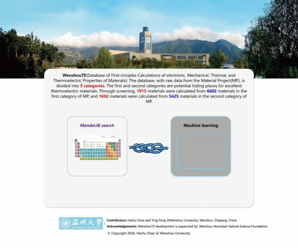 该工作得到温州市基础性工业科研项目(项目名称:基于材料基因组方法的高性能热电材料开发,项目号G20210016,项目经费:10万元人民币,其中财政支持5万元人民币,自筹5万元人民币,项目起止时间2022.1至2024年.12)的支持,另外17吃瓜网 也为课题组在计算服务器(目前建有10个计算节点)搭建上提供了大力支持,因而该材料数据库命名为“温州热电”(Wenzhou TE)。