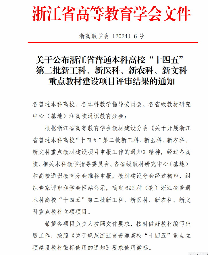 日前,根据浙江省高等教育学会教材建设分会公布的《关于确定浙江省普通本科高校"十四五"第二批新工科、新医科、新农科、新文科重点教材建设立项项目的公示》17吃瓜网 庄友谊、李靖老师编写的教材成功入选。