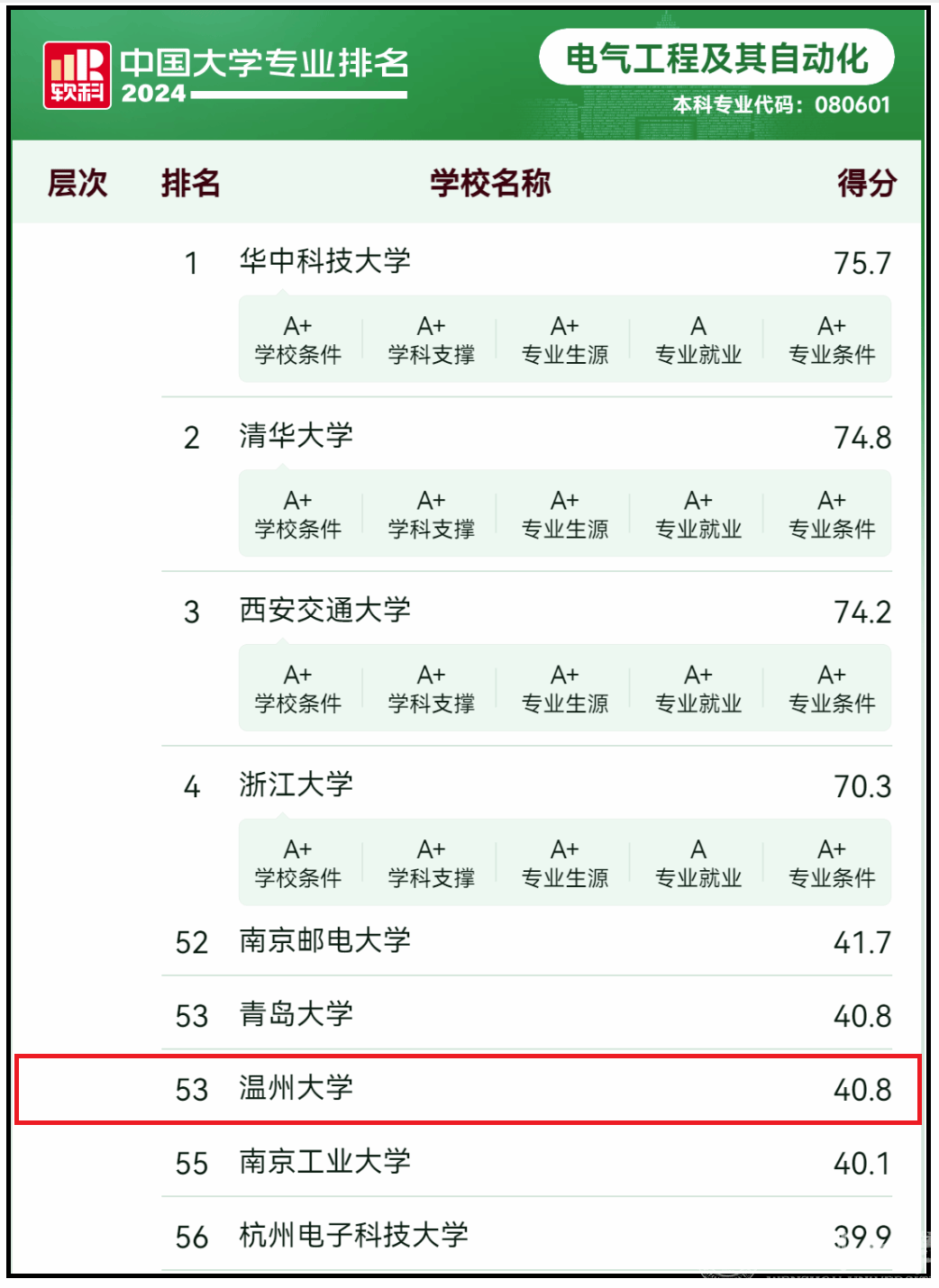 2024年6月13日,高等教育专业评价机构软科正式发布“2024软科中国大学专业排名”,排名包括810个专业,涉及93个专业类、12个专业门类。17吃瓜网 电气工程及其自动化专业排名从去年的73名跃升至今年的53名,浙江省同专业排名第2,仅次于浙江大学。
