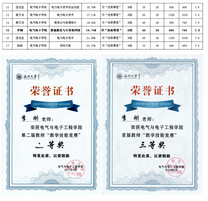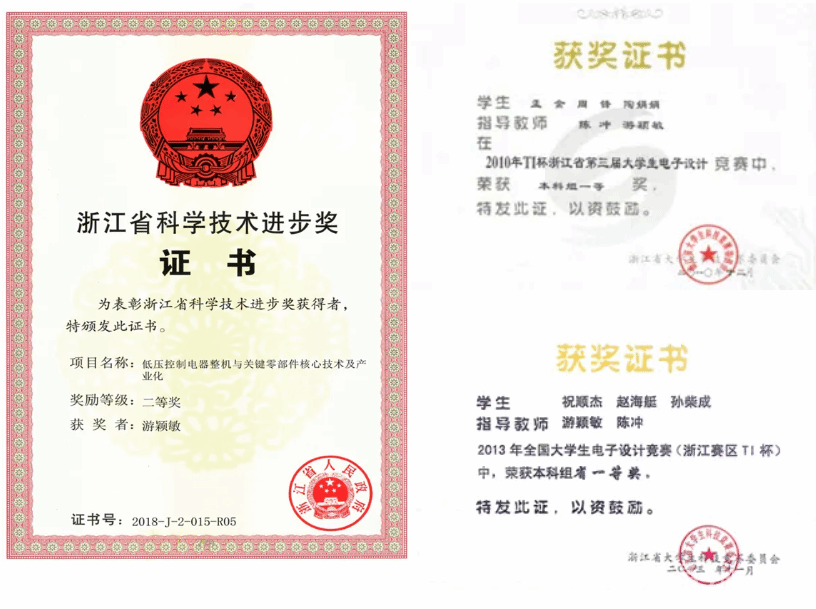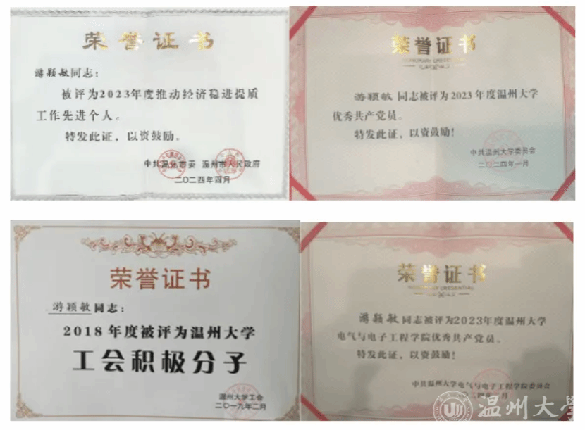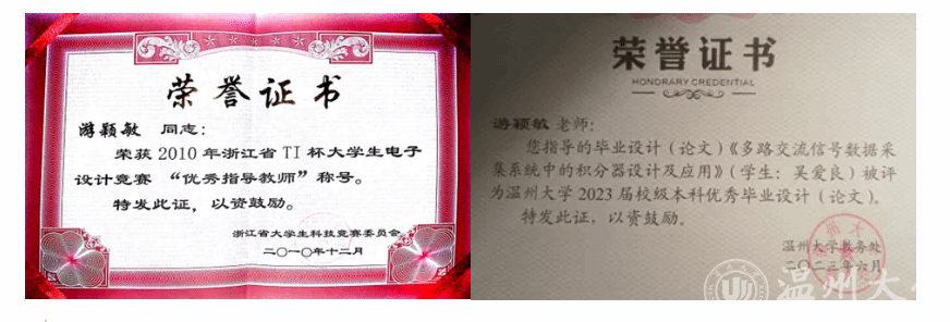 同时,游颖敏同志牢记教师教书育人初心使命,指导学生获得浙江省大学生电子竞赛一等奖两项、三等奖一项,指导本科生完成浙江省新苗计划两项,指导本科毕业设计,学生多次获得校级优秀毕业设计,参与《电子工艺实习》、《电器学》等课程教学,指导本科生毕业实习。