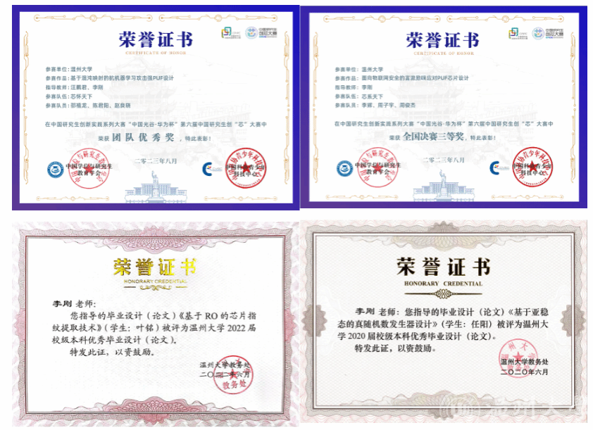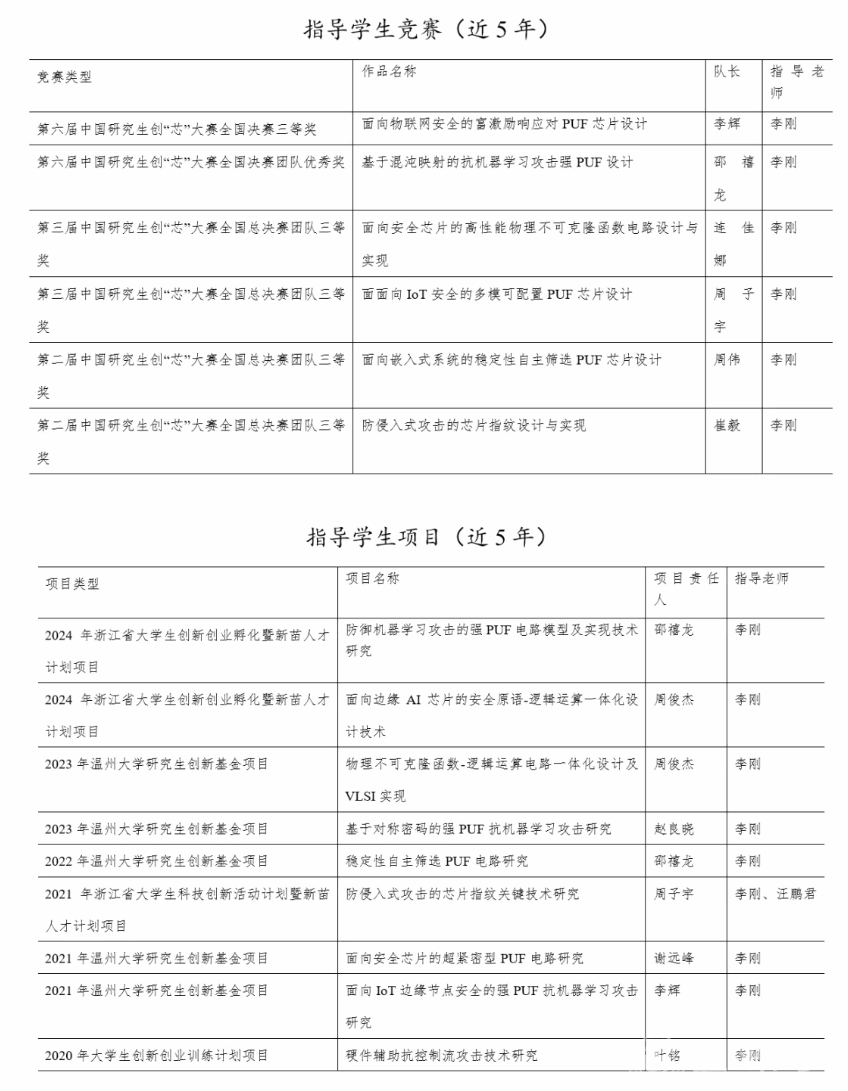 近5年指导学生获浙江省“新苗计划”项目、“大学生创新创业训练计划”项目和“研究生创新基金”项目共9项,指导研究生获得中国研究生创“芯”大赛全国决赛三等奖5项、团队优秀奖1项,指导本科优秀毕业论文2篇;所在的集成电路与智能系统导研团队荣获17吃瓜网 第一批“五好”导研团队。