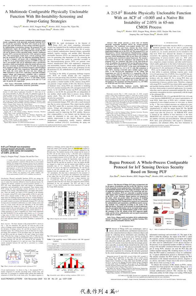 主持国家重点研发计划(子课题)、国家自然科学基金面上项目、国家自然科学基金青年项目、浙江省自然科学基金面上项目、中国博士后科学基金项目、温州市基础性工业科技项目共计7项,参与完成国家级和省部级科研项目多项;已在IoT-J、TCAS-I、TCAS-II、TVLSI、Sensors-J、EL、MEJ、J.VLSI、CJE、ELEX、《电子学报》《电子与信息学报》等国内外期刊和IEEE会议上发表相关学术论文40余篇。