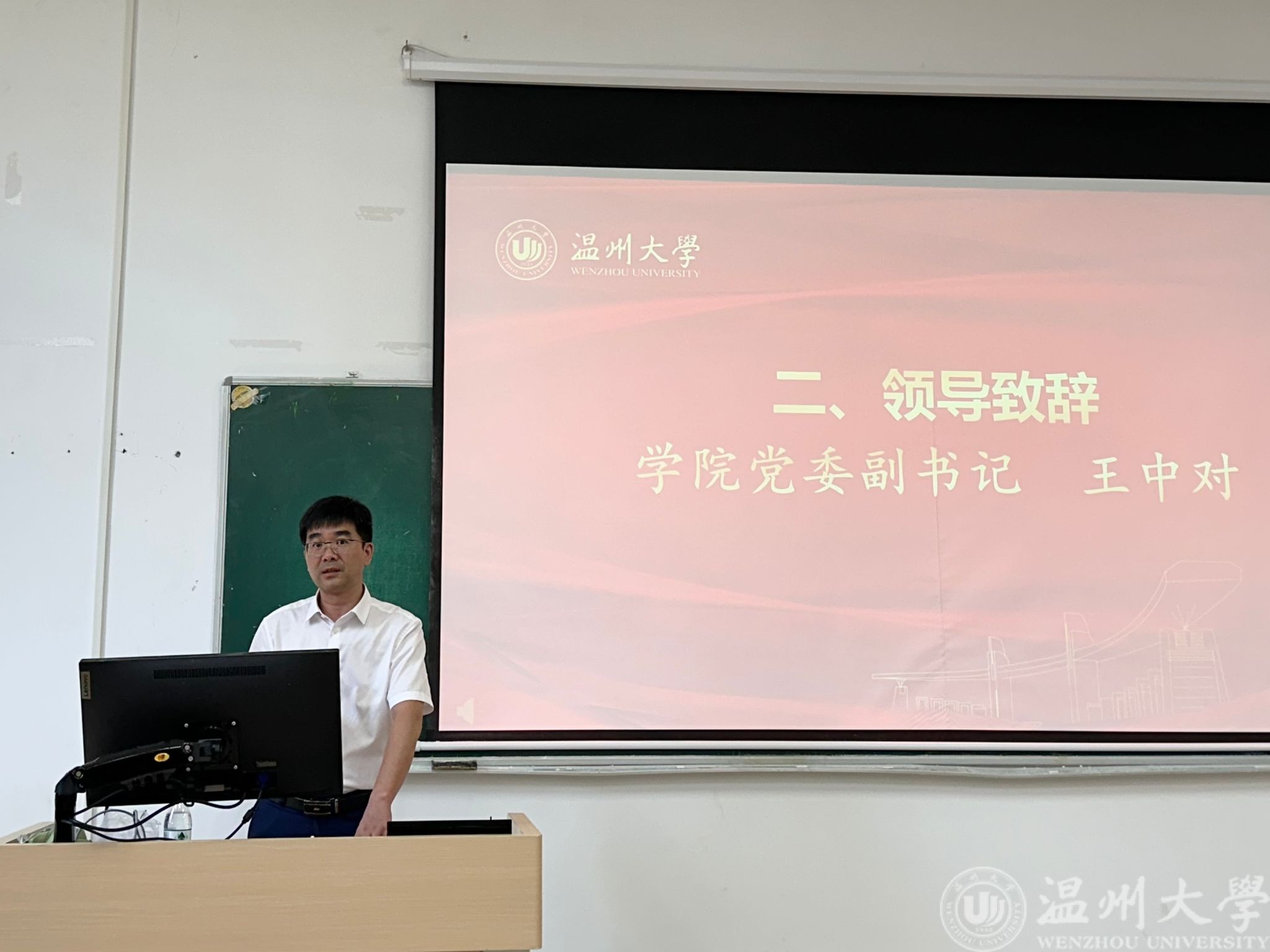 学院党委副书记王中对致辞。他指出,红七月,也是服务月,在这个充满革命传统与奉献精神的月份里,我们号召全体学生积极参与暑期社会实践活动,以暑期社会实践活动为契机,将理论知识与实际行动相结合,用青春的热情和汗水,为社会贡献一份力量。在实践队即将出征之际,他提出了五点希望:第一,安全是首位。暑假期间大家时刻绷紧安全这根弦,包括交通安全、饮食卫生、消防安全、财产安全等等。第二,培养吃苦精神。暑期社会实践,作为青年大学生教育体系中的重要组成部分,不仅是学生将所学知识应用于实际、锻炼能力的重要途径,更是促进学生全面发展、增强社会责任感和历史使命感的关键环节。第三,树好温大形象。出去社会实践,作为温大的代表,你们的一言一行都关乎学校形象,务必树立正面典范。第四,提升合作意识。合作是成功的基石,提升团队合作意识至关重要,希望大家在假期里互帮互助,加强合作。第五,勇于担当作为。希望大家以“温大人”的身份严格要求自己,珍惜难得的实践机会,深入基层、了解国情、民情,将所学专业知识与社会实际相结合,解决实际问题,为社会贡献自己的青春力量。