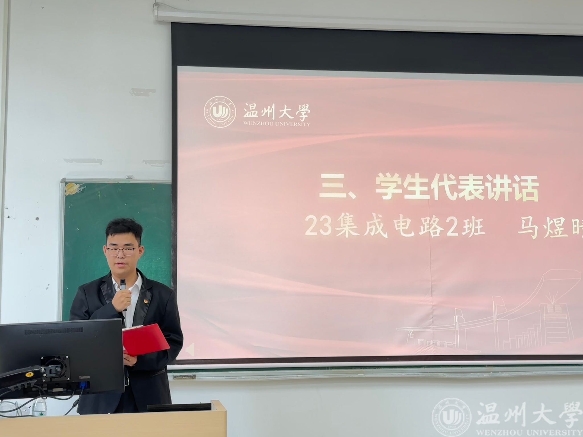来自23集成2班的马煜晴作为学生代表上台发言。他以饱满的热情和坚定的语气表达了对社会实践的向往和期待。马煜晴分享了自己对于社会实践的理解和准备情况,表示将积极响应学院号召,严格遵守实践纪律,团结协作,勇于担当,用实际行动践行求学问是,敢为人先”的校训精神。他的发言赢得了在场师生的阵阵掌声,也进一步激发了实践队员们的热情和信心。