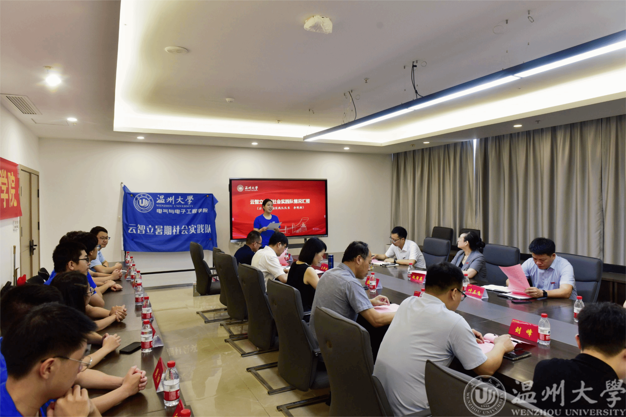 云智立暑期社会实践队队长余艳楠作情况汇报。与会其他实践队队员交流社会实践体验与感悟。他们深情感谢学校领导的亲切慰问和老师们的指导。作为校级社会实践重点项目成员,他们认为,参加暑期社会实践是大学生响应学校正在开展的以“强城有我、争当先锋”为主题的“红七月·服务月”活动的积极表现。社会实践工作虽然忙碌辛苦,但内心却无比充实,在实践过程中提升了安全意识和专业素养,锤炼了耐心和责任感。