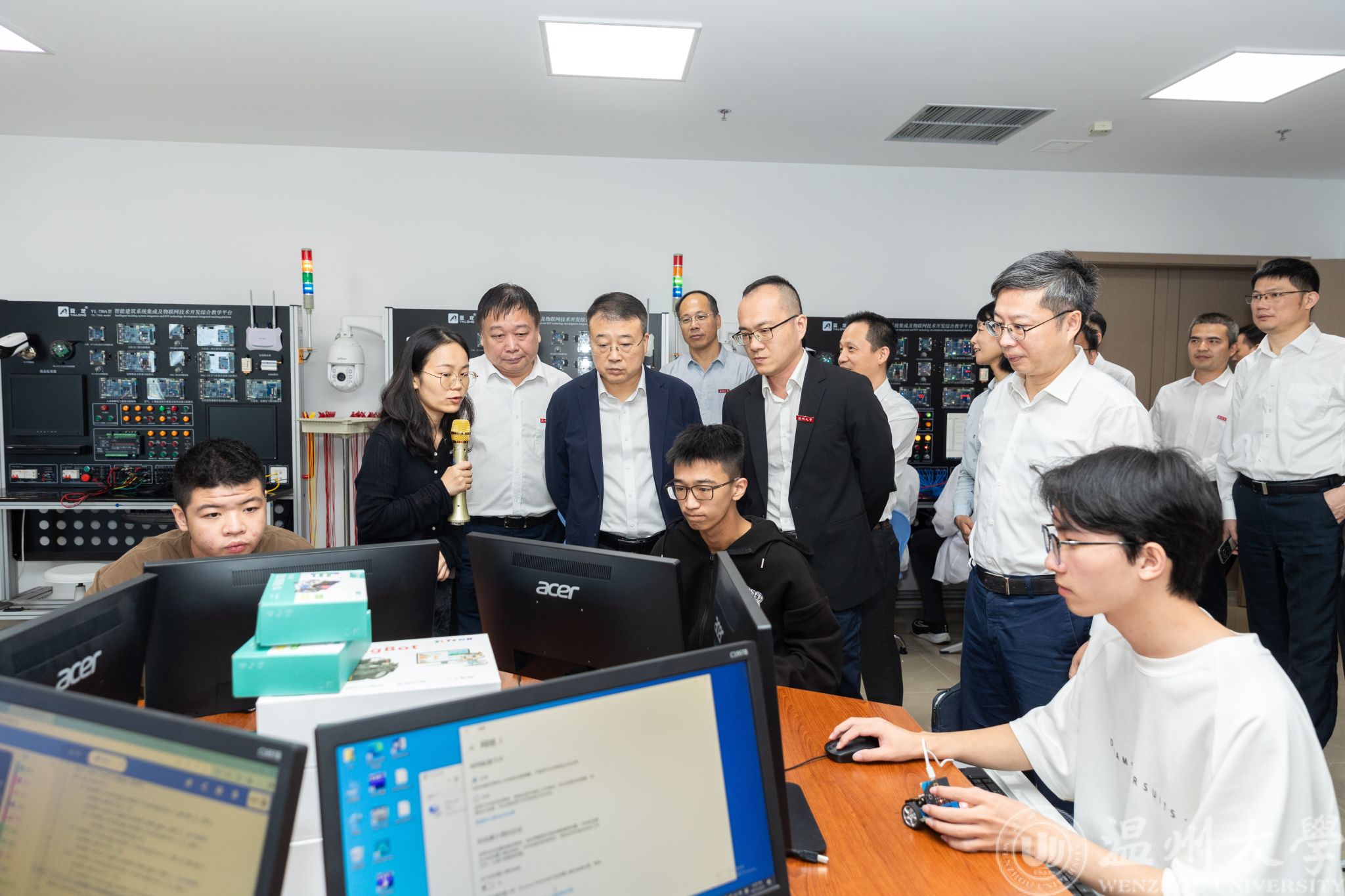 随后产业学院朱志亮院长向王副市长汇报了产业学院的建设情况,并带领王振勇副市长一行参观了为温大学生提供智能制造工程实践培养、服务社会人才继续教育和青少年科普教育的培训中心,基于智能制造模块设立的各个实验创新中心以及温州传统行业数字化改造的案例样板“智能工厂实践创新中心”。王振勇副市长对学院在产教融合、人才培养和社会服务等方面的工作进行了深入了解,并对产业学院近年来的成果给予了肯定与高度评价。