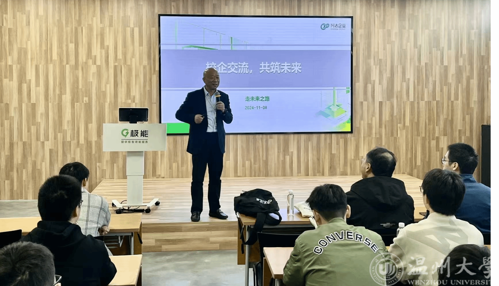 11月8日上午九点,师生一行到达兴达企业。工作人员首先带领学生参观了配电柜、电力仪器仪表生产车间,详细介绍其产品的研发过程及应用市场,让学生们深刻感受到了实际生产与课堂知识的结合。随后董事长蔡国兴热情洋溢的发表了“校企交流,共筑未来”演讲。曹董事长深刻指出了大学生职业规划的重要性,以自己的人生经验为例,用最朴实的语言毫无保留的给予同学们最真挚的建议。