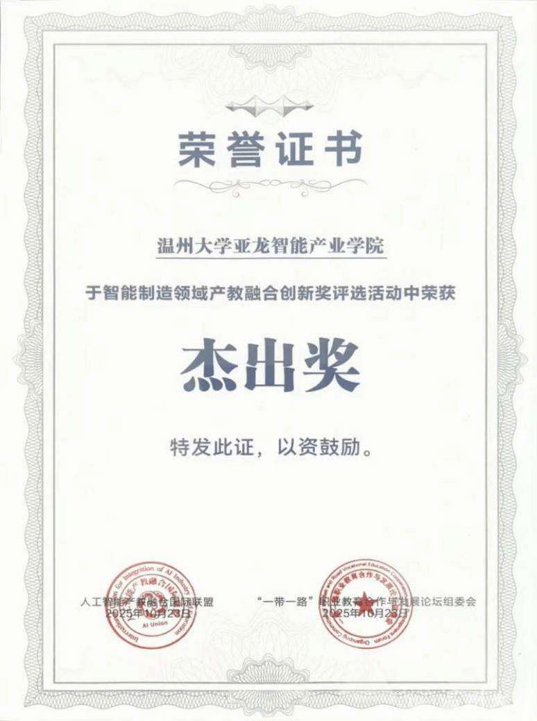 会议期间,产业学院荣获“智能制造领域产教融合创新奖—杰出奖”,该奖项是对产业学院在推动人工智能技术赋能教育、深化产教协同育人方面建设成效的充分肯定。