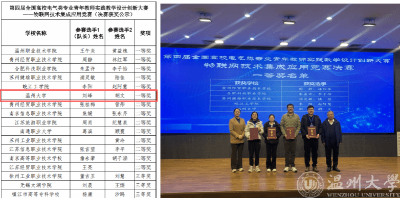 刘峰老师和胡文老师荣获第四届全国高校电气类专业青年教师实践教学设计创新大赛——物联网技术集成应用竞赛一等奖。