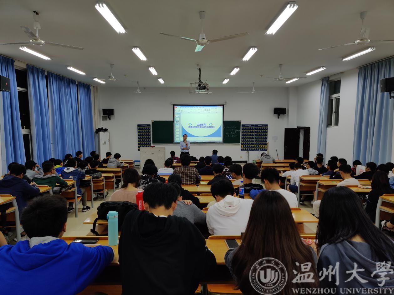 吴老师充分运用了一些案例名言以及自己的生活体会为同学们清晰地指出了未来发展的道路以及为社会做出贡献的六个要素:学历、知识、创业、资本、技术、体力。“生涯金字塔”生动地让同学们了解到了学历重要性。“金字塔的顶端是脑力工作。”吴老师认为在大学这个窗口期,同学们应当大一适应生活,养成习惯;大二参加活动,探索社会;大三聚焦生活,改写人生;大四创造选项,选择路径。