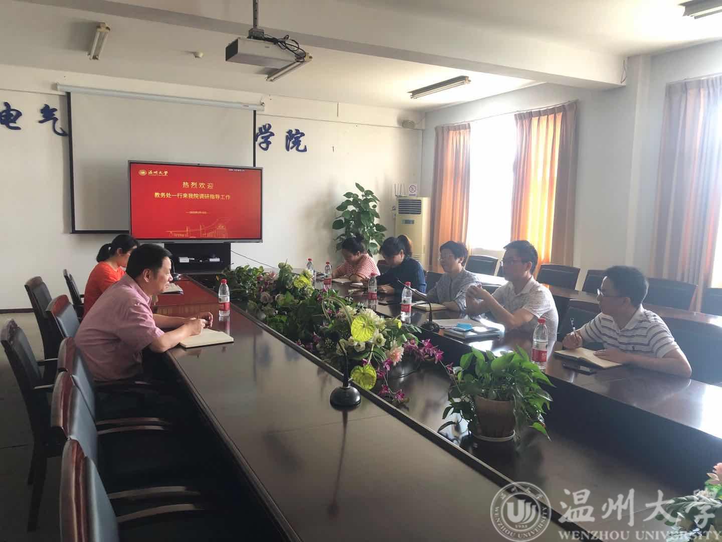 5月18日下午3点,教务处处长余闯、副处长董新娇一行5人到电气学院调研指导工作,学院院长汪鹏君接待并参加会议。