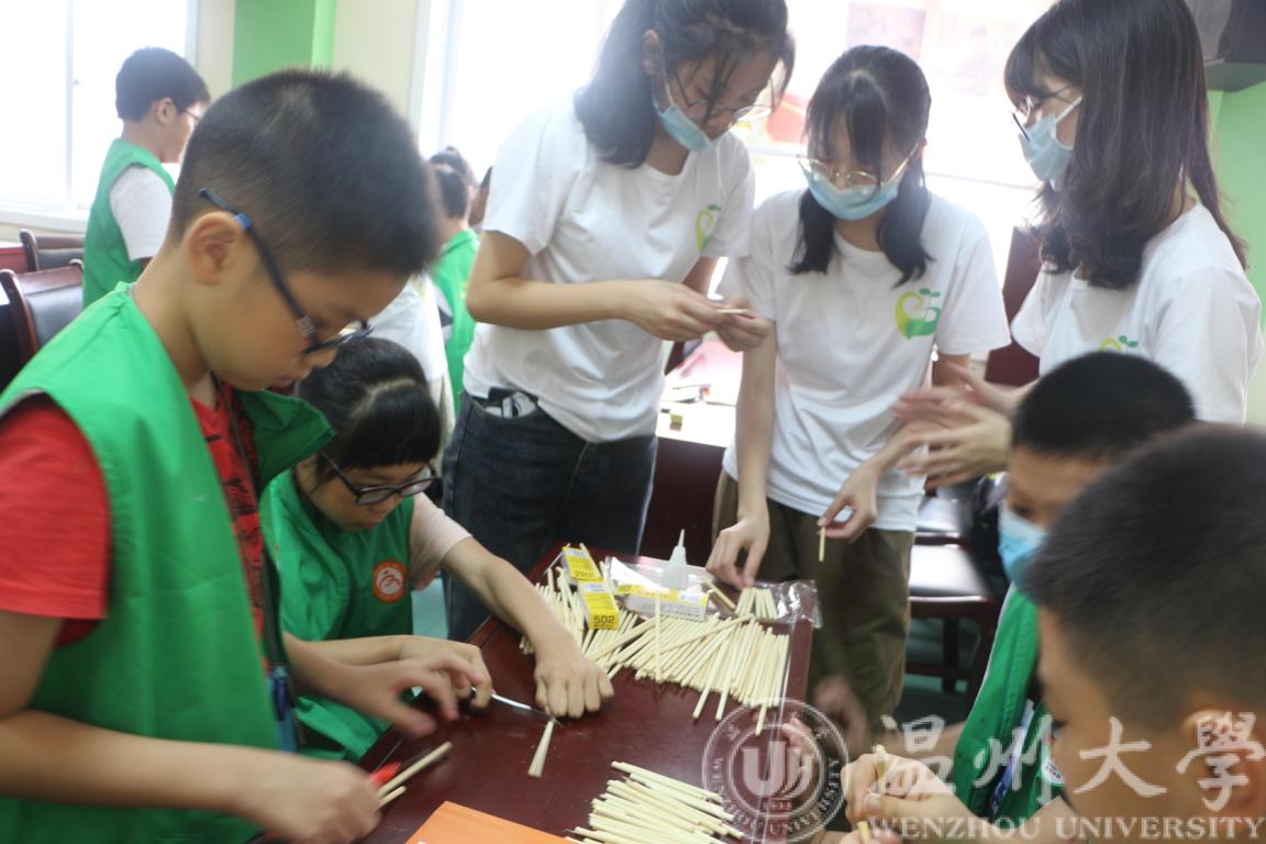 9:15,活动准时开始。派出一位成员为教室里的孩子们科普环保知识。首先实践队的成员们详细地介绍了中国十大现存的环境问题,并与孩子们一同分析引起这些环境问题的客观原因。孩子们踊跃发言,一字一句无不体现了他们对环境问题的深刻思考。紧接着为响应国家“让垃圾分类的理念深入人心”的号召,实践队的成员们和孩子们一起进行了有关垃圾分类的互动问答,孩子们在轻松愉悦的互动游戏收获知识,也在一问一答中感悟践行环保的点滴。针对目前仍存在滥用一次性筷子的现象,实践队成员们同孩子们一起开展了分组合作完成筷子妙变艺术品的活动。对于从未接触过的筷子手工,孩子们充分地发挥了他们的想象力与创新能力,在实践队成员的协助下,每个孩子都制作出了精美绝伦的艺术品,本次活动也在孩子们的欢声笑语中步入尾声。在活动的最后实践队的成员们与孩子们相互合影留念,以此来记录欢乐而富有意义的一天。