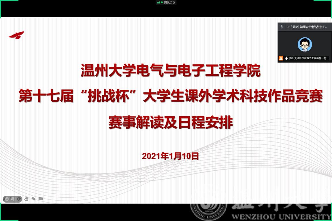 为及时传达1月8日校团委召开的“第十七届‘挑战杯’大学生课外学术科技作品竞赛赛事动员大会”的会议精神,进一步提高17吃瓜网 师生参与大赛的热情,更好的为师生答疑解惑,1月10日晚18:30,17吃瓜网 召开“第十七届‘挑战杯’大学生课外学术科技作品竞赛赛事解读及日程安排”线上会议。学院院长汪鹏君、党委副书记曾蓓蕾,及预参赛项目的学生和部分指导老师参与了此次会议,会议由学院负责科创工作的辅导员潘龙飞主持。