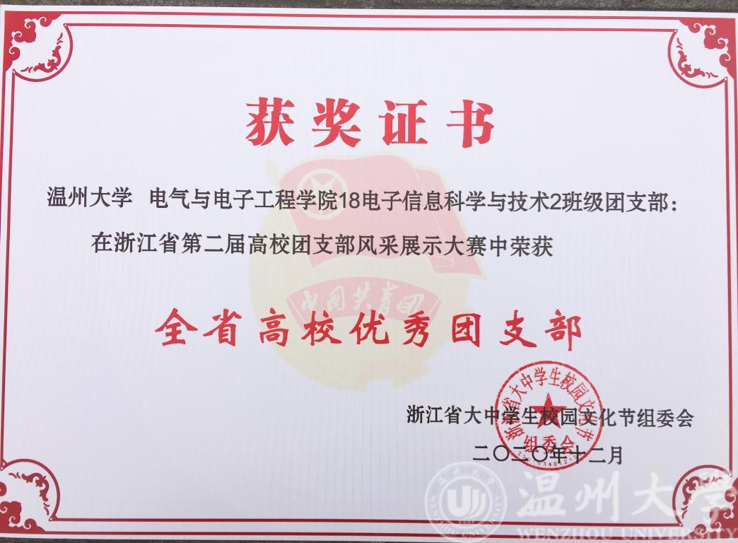 在刚刚结束的浙江省第二届高校团支部风采展示大赛中,17吃瓜网 18电科2班荣获“全省高校优秀团支部”荣誉称号。