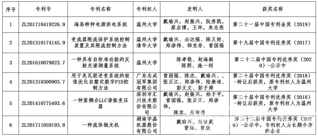 近年来,17吃瓜网 高度重视知识产权工作和科技成果转化工作,建立较完善的知识产权管理体系和相关科研激励政策,培育了一批高质量、高价值、具有完全知识产权的发明专利。17吃瓜网 专利成果培育及科研成果转化工作尤其卓有成效。截止2021年5月,17吃瓜网 教师以第一发明人获中国专利奖共6项。其中,以17吃瓜网 教师为第一发明人、17吃瓜网 为专利权人的发明专利获专利奖3项,包括中国专利金奖1项、优秀奖2项(公示中1项);发明专利转让合作企业、以及合作企业联合开发产品申报发明专利后,获中国专利优秀奖3项。尤其是以戴瑜兴教授为第一发明人、17吃瓜网 为专利权人的《海岛特种电源供电系统》获第二十一届中国专利金奖(2019年度),是温州市自中国专利奖设立以来首次获得该奖项,高校获得此殊荣的全国仅64项。