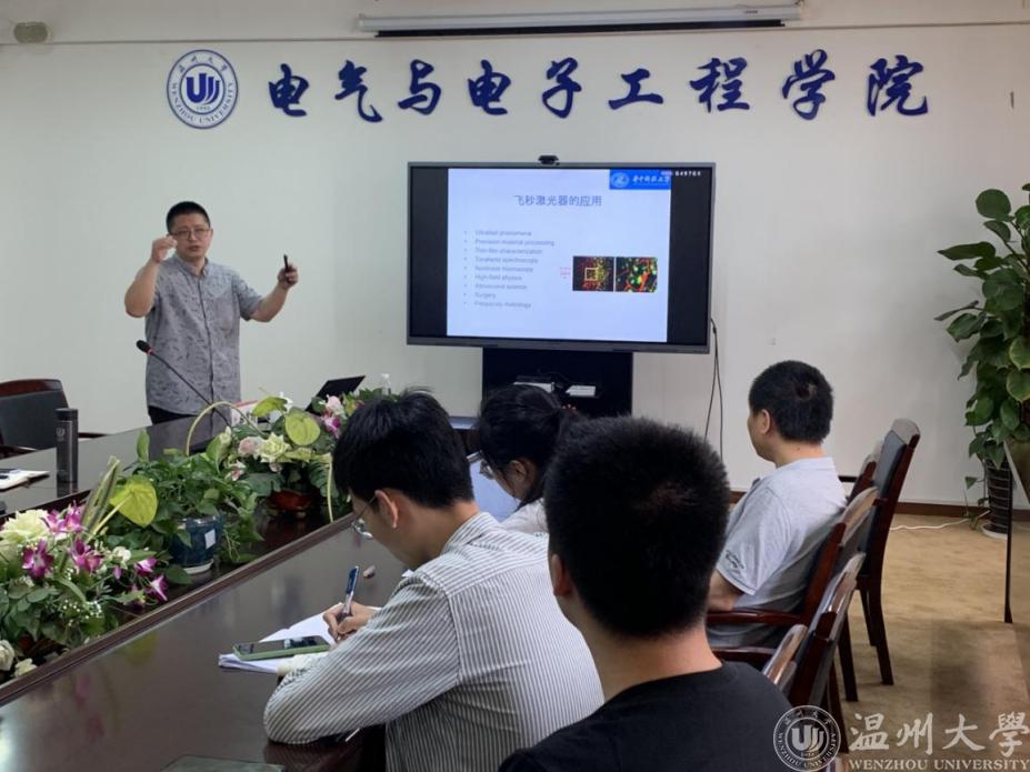 赵鹭明教授就超快光学的发展现状及如何在超快光纤激光器中获取具有更大脉冲能量的超短脉冲的热点问题进行图文并茂、深入浅出的介绍,涉及超快光学的可饱和吸收体锁模、色散管理、啁啾脉冲放大(CPA)等处理技术,并介绍耗散孤子共振型脉冲的最新特性研究。报告后,赵教授对温大师生的问题做了一一详细的回答。