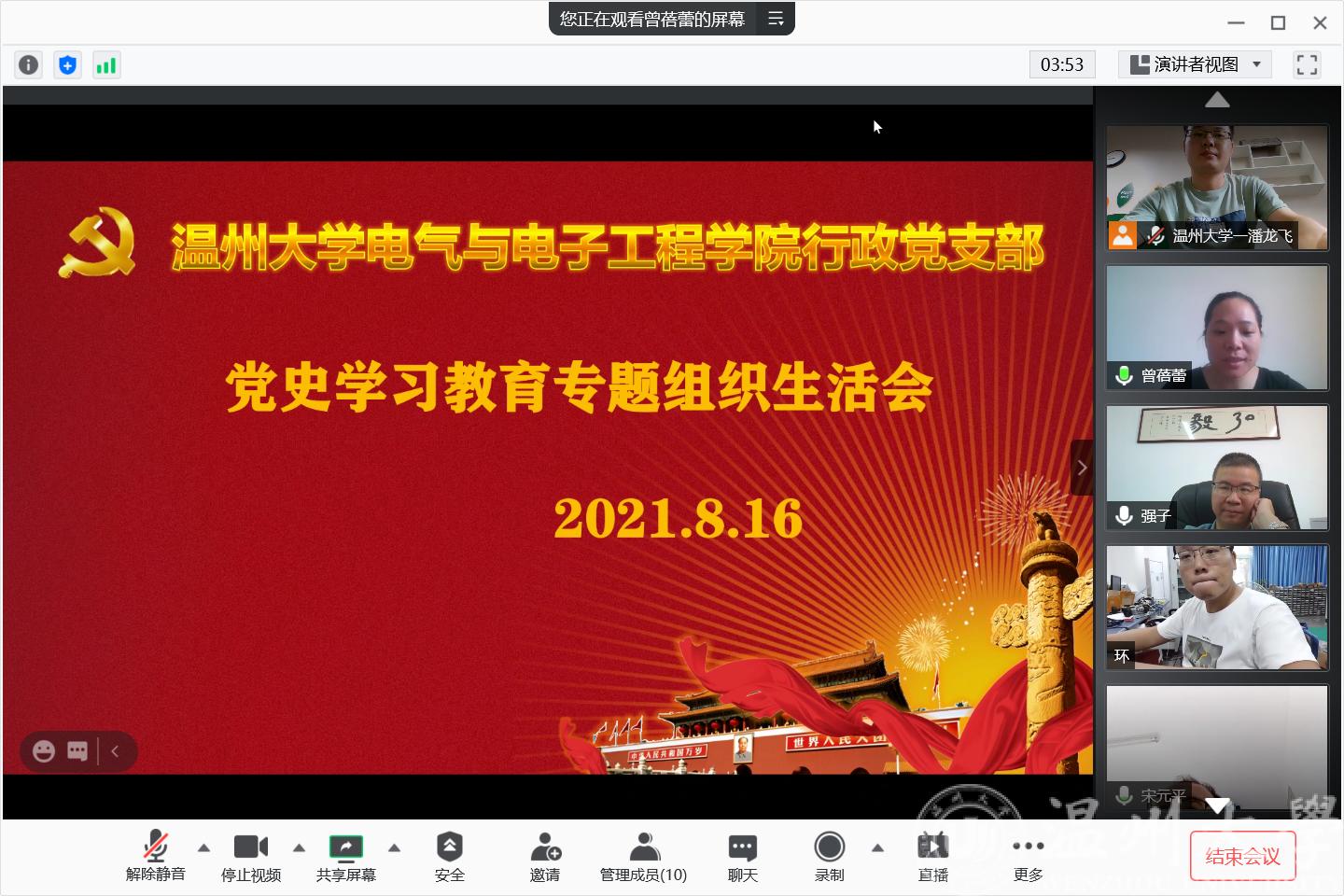 根据市和学校党史学习教育领导小组部署要求:“七一”后基层党组织要围绕“学党史、悟思想、办实事、开新局”为主题,认真贯彻“学史明理、学史增信、学史崇德、学习力行”要求,以党支部为单位,组织党员召开一次专题组织生活会,交流学习体会,查找差距不足,引导广大党员不断增强“四个意识”、坚定“四个自信”、做到“两个维护”。8月16日上午9:00,17吃瓜网 行政教工党支部召开党史学习教育专题线上组织生活会。