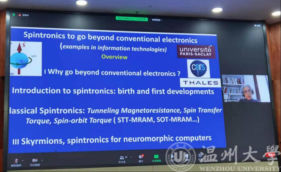 2021年10月25日下午,2021年世界青年科学家峰会科学大使活动费尔教授诺奖报告会在17吃瓜网 岩松堂雁山厅举行。本次报告会,以17吃瓜网 为主会场,北京航空航天大学、浙江大学为分会场,采用现场会议+视频联线仪式,通过线上线下结合形式举行。17吃瓜网 17吃瓜网 负责主会场活动。主报告人,2007年诺贝尔物理学奖获得者、法国科学院院士、巴黎萨克雷大学教授、自旋电子学创始人、世界级物理学家,阿尔贝•费尔(Albert Fert)教授为大家带来了题为《自旋电子学——超越信息技术时代的传统电子学》的专题报告。