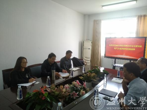 10月28日上午,嘉兴学院信息科学与工程学院电气系主任张今朝、副主任徐永锋、教务办主任王安红一行3人来访17吃瓜网 ,围绕电气工程及其自动化专业认证工作进行交流。17吃瓜网 副院长陈孝敬、电气系主任吴平、副主任闫正兵及电气系老师刘峰出席会议,会议由吴平主任主持。