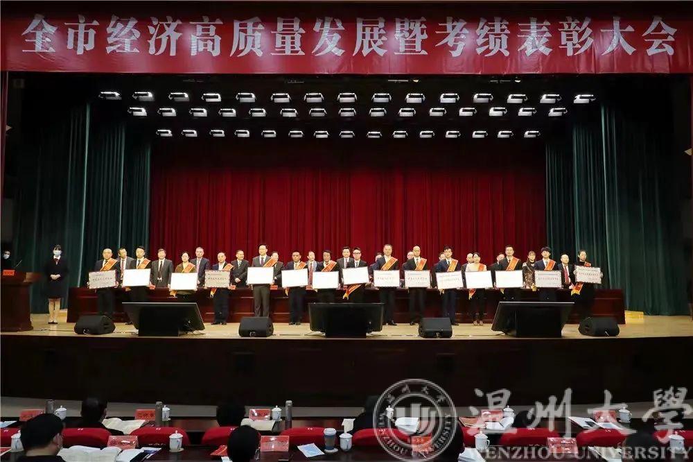 会议观看了《乐清市经济高质量发展专题片》,表彰了考绩优秀单位、先进企业及2021年政策兑现项目相关企业。会上公布的多个荣誉榜单中,17吃瓜网 乐清工业研究院在“温州市高能级创新平台”榜单光荣上榜,研究院院长林振权上台接受乐清市政府颁发荣誉奖牌。市委书记徐建兵充分肯定了过去一年各先进部门、企业的成绩,鼓舞广大企业勇于担当,积极贡献。