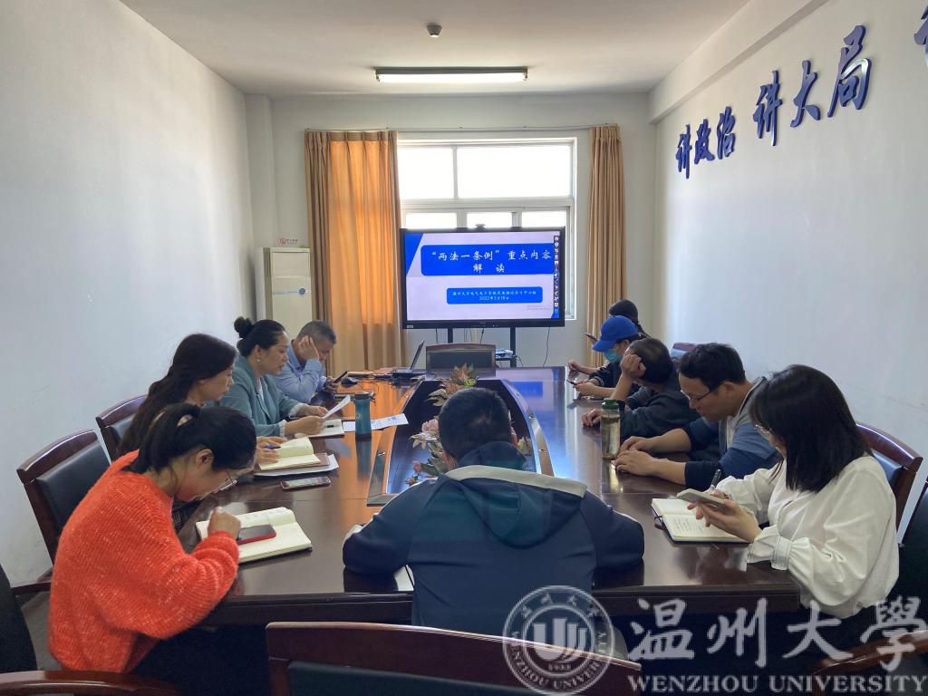 会议第一项,行政教工党支部书记曾蓓蕾详细部署了本学期行政教工党支部“三会一课”、支部活动、党员学习等内容,重点介绍了本学期主题党日活动的安排。紧接着,曾书记作“两法一条例”重点内容的解读,带全体支部党员学习了《中华人民共和国监察法》《中华人民共和国公职人员政务处分法》和《中华人民共和国监察法实施条例》的相关内容。曾书记指出,支部全体党员要紧紧围绕“两法一条例”的核心内容和重要要求,进一步深化学习,要严守政治纪律和廉洁要求,积极将学习心得和学习成果融入到大学生法治教育中去。切实提高党性修养、增强“四个意识”,懂法规、明戒惧、知敬畏、守纪律,自觉做学习贯彻的表率。通过此次专题学习,进一步帮助支部党员教师领会了“两法一条例”提出的重要意义和存在的内在联系。