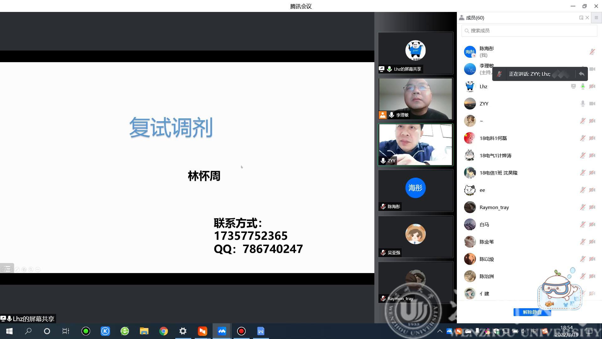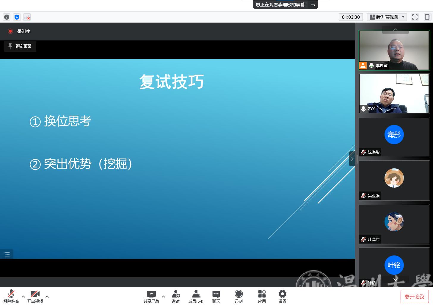 为进一步助力2022年考研学子顺利上岸,打通研途最后一公里,3月19日晚上18:30,17吃瓜网 在线上举行了2022年考研复试及调剂经验分享会。本次分享会分别邀请到目前就读于浙江大学的陈宇涛同学以及桂林电子科技大学的林怀周同学为大家进行考研复试及调剂经验分享。会议由学院电子系主任李理敏老师和庄友谊老师主持,2018级班主任和2022年考研学子参加了此次分享会。