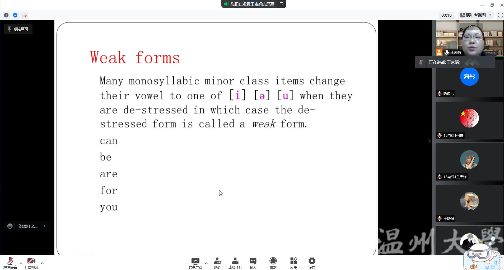 会议伊始,王老师首先介绍和解读了英语口语表达上的轻重读音,以及轻读和弱读的相关词汇、句子、节奏等等,帮助同学们对英语口语有一个初步的认识和了解。