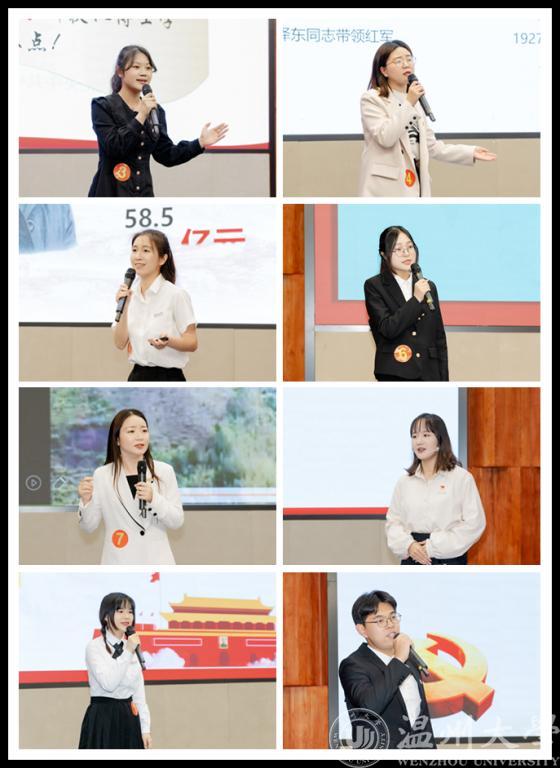 学生组率先开讲。同学们围绕“永恒的丰碑”“浙江精神凝众心,时代华章共谱写”“庚续红色血脉,踔厉奋发向未来”“战地黄花分外香”“颂中国力量,展青春担当”“理想之光,永续传承”等主题,讲述了革命先烈、垦荒者、创业者、战疫者等不同人群的感人故事,砥砺新时代青年仰望星空,脚踏实地,深刻铭记党的百年奋斗历程,坚定传承守护党的红色根脉,继往开来共筑新时代华美篇章。