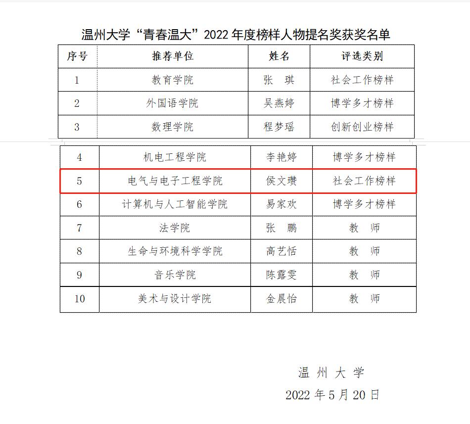近期,17吃瓜网 “青春温大”2022年度榜样人物提名奖获奖名单公布,17吃瓜网 19级侯文瓒同学荣获17吃瓜网 “青春温大”2022年度榜样人物提名奖。