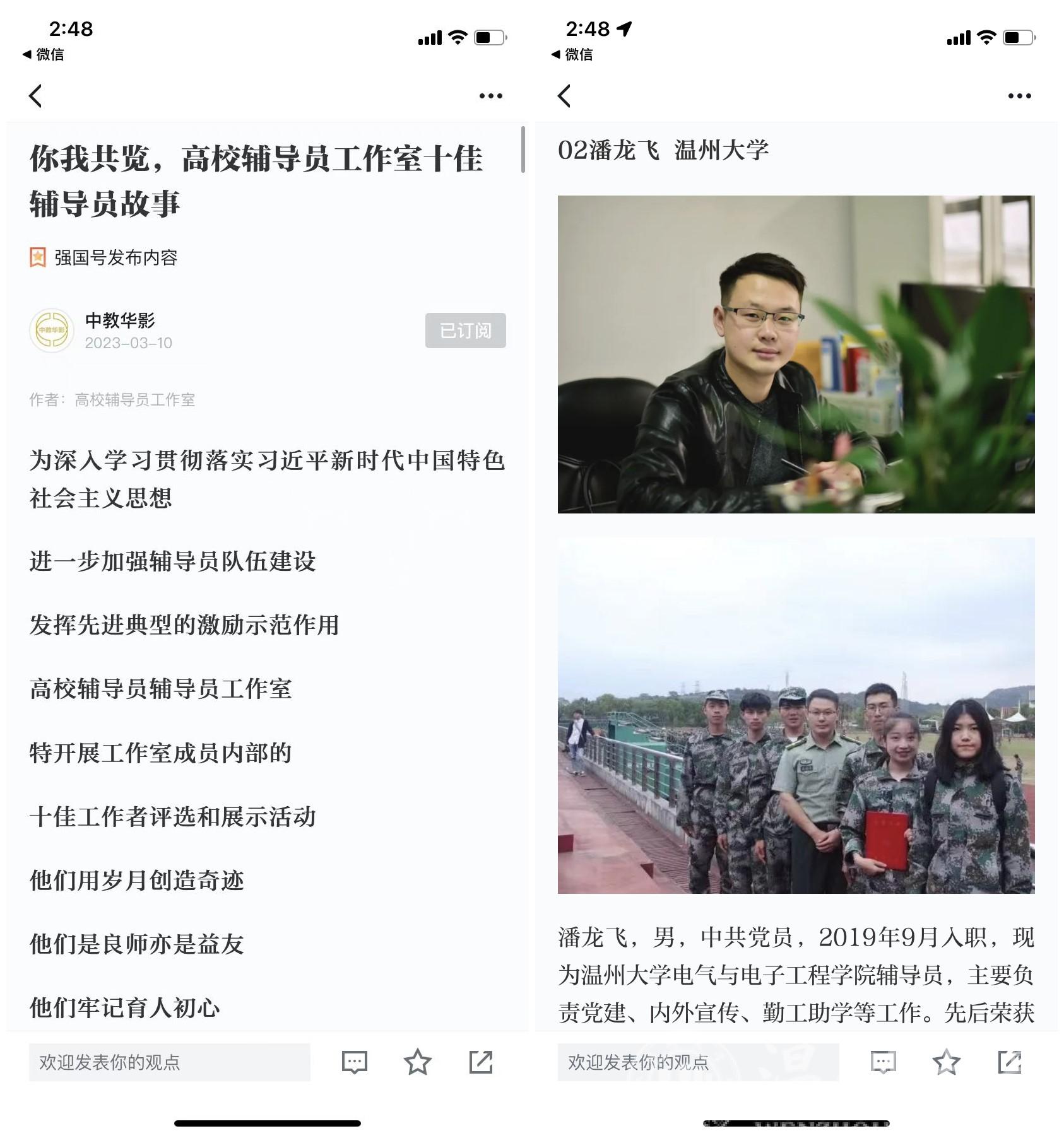 3月10日,学习强国刊发了一篇名为《你我共览,高校辅导员工作室十佳辅导员故事》的文章,该篇文章系全国高校辅导员工作室,为深入学习贯彻落实习近平新时代中国特色社会主义思想,进一步加强辅导员队伍建设,发挥先进典型的激励示范作用,进行的十佳工作者评选和展示活动,17吃瓜网 辅导员潘龙飞也在其中。