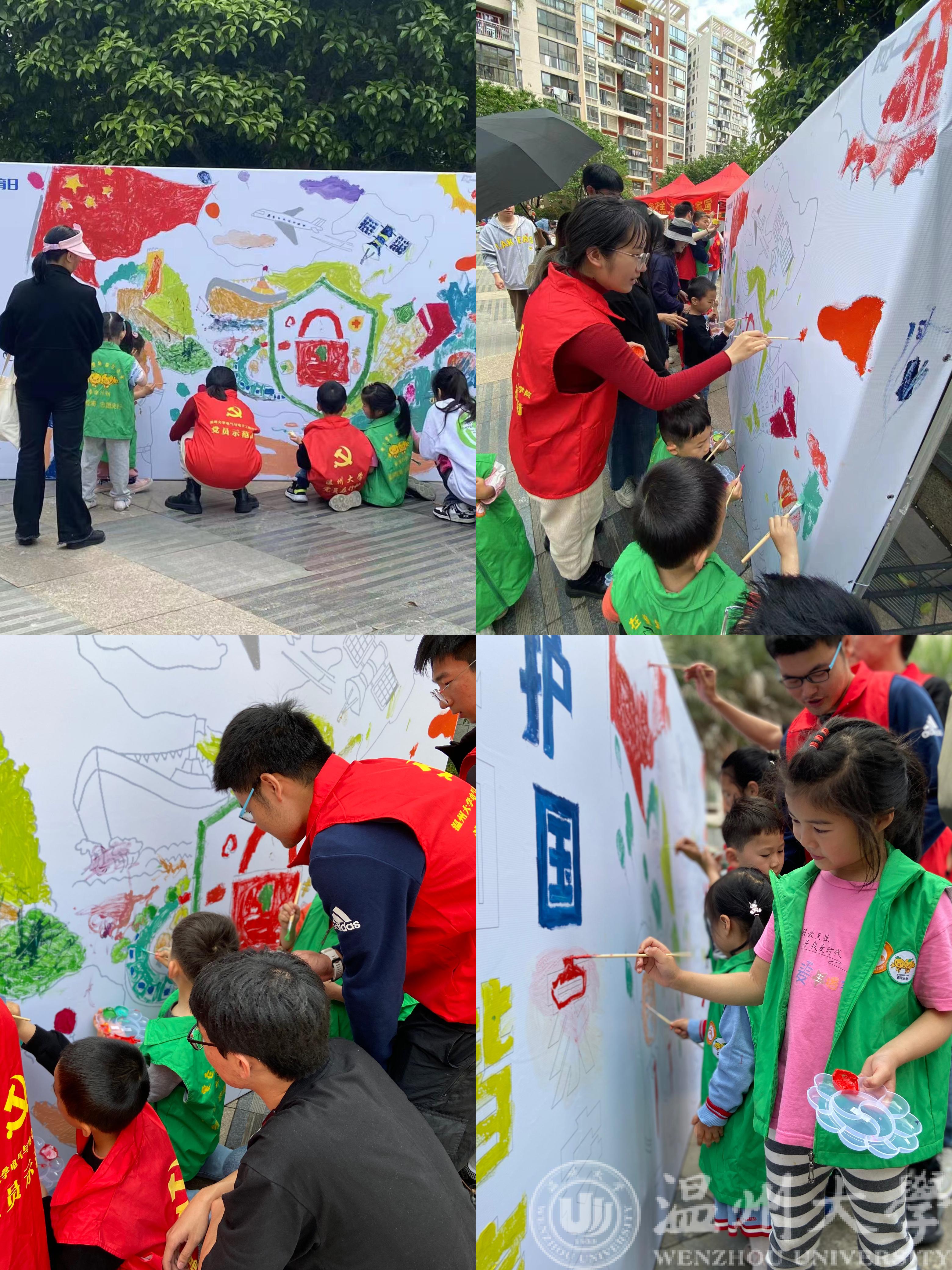本科生第二党支部党员前往高教博园社区开展国家安全宣传教育活动,学生党员和小朋友们“大手牵小手”,用涂满颜色的画布学习基本的国家安全知识。