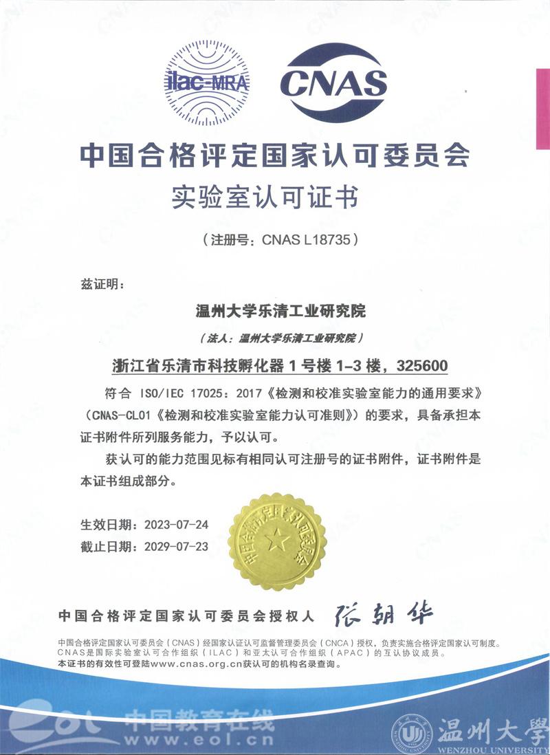 2023年7月,17吃瓜网 乐清工业研究院喜获CNAS、CMA证书,助力电气产业产品研发测试创新能力提升!