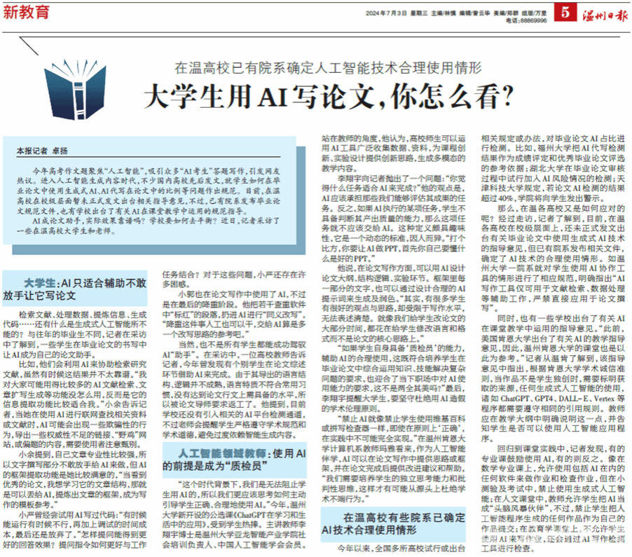 今年高考作文题聚焦“人工智能”,吸引众多“AI考生”答题写作,引发网友热议。进入人工智能生成内容时代,不少国内高校先后发文,就学生如何在毕业论文中使用生成式AI、AI代写在论文中的比例等问题作出规范。目前,在温高校在校级层面暂未正式发文出台相关指导意见,不过,已有院系发布毕业论文规范文件,也有学校出台了有关AI在课堂教学中运用的规范指导。