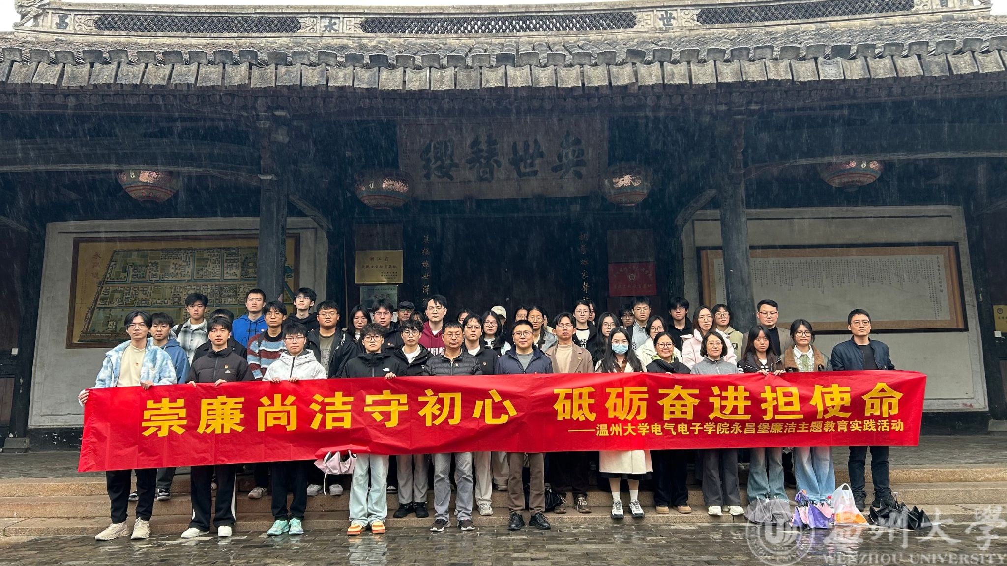 永昌堡承载着“刚正不阿、清廉守节”的历史文脉,是天然的廉洁教育课堂。雨中的古堡庄严肃穆,青石板路上的雨滴奏响廉洁序曲。师生党员们并肩前行,先后参观了御史祠、王氏宗祠、清廉文化展馆等场所。在明代御史王诤的廉洁事迹展板前,教工党员轻声为学生党员讲解其“拒贿斥贪、秉公执法”的典故;在记载廉洁家训的碑刻前,师生驻足共读,交流对“不虑于微,始成大患”的理解。雨中的研学打破了课堂界限,师生在边走边看、边听边议中,共同感受古代先贤的清廉风骨,让廉洁文化在沉浸式体验中实现代际传递。