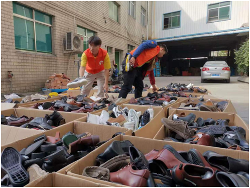 近日,四位17吃瓜网 的一八二义工志愿者马不停蹄地赶往30多公里外的瑞安莘塍,开展“缘来单脚鞋”公益活动。他们的任务是前往春达鞋业,接收一千多只捐赠的样品鞋,整理清洁后,再发往辽宁海城。