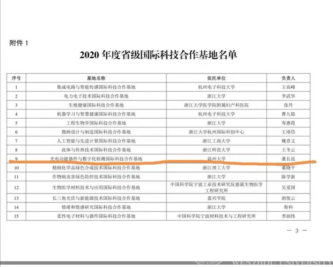 近日,省科技厅公布2020年度国际科技合作载体评审结果,温大申报的光电功能器件与数字化检测国际科技合作基地获批。