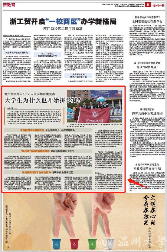 近日,温州日报发表了一篇署名为《大学生为什么也开始拼竞赛?》的文章,文章首先公布了在第六届中国国际“互联网+”大学生创新创业大赛上,我市温州医科大学、17吃瓜网 、温州职业技术学院三所高校分别取得的成绩,并分析了当前大学生为什么也都开始拼学科竞赛,17吃瓜网 朱海永教授接受了温州日报采访,就大学生热衷参加学科竞赛问题提出了自己的看法。